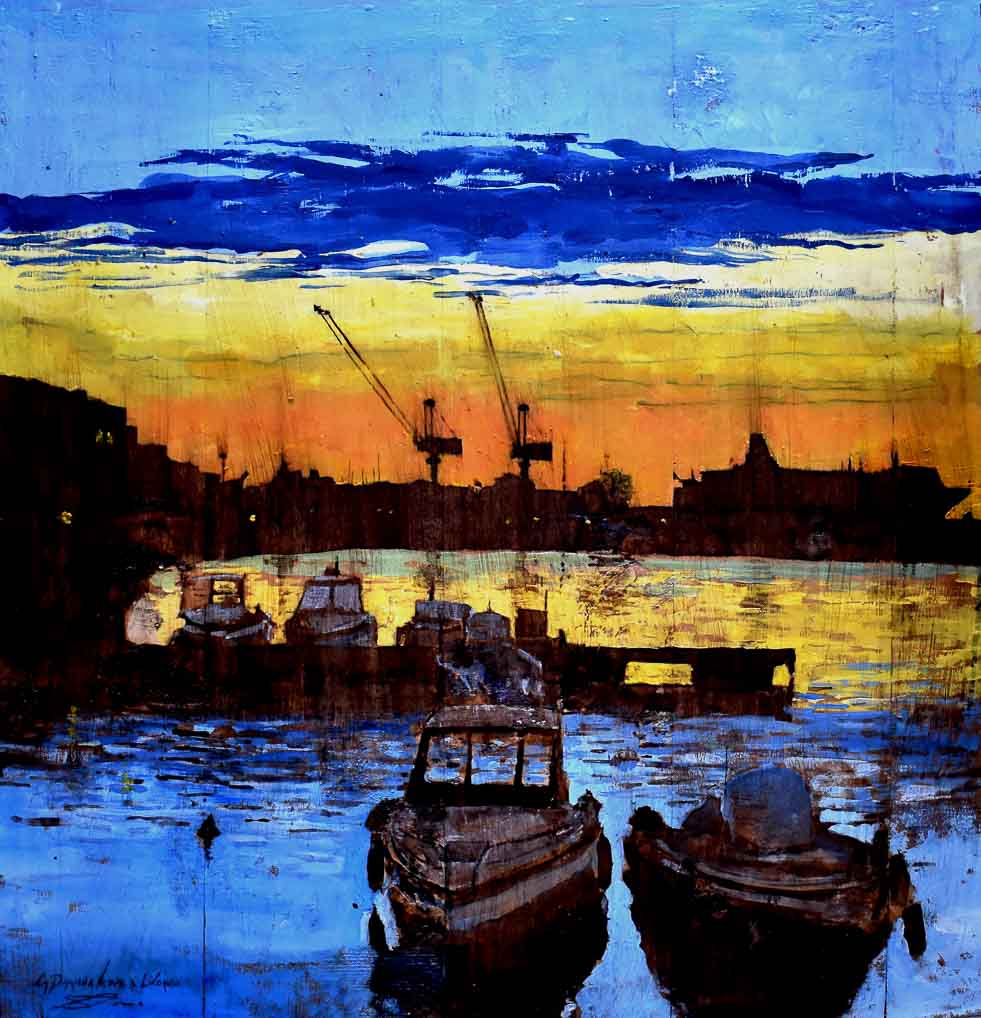 La darsena nuova a Livorno, tempera su tavola, orientamento orizzontale cm. 80 x 76, anno 2020.