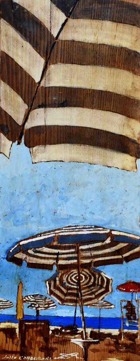 Sotto l’ombrellone, tempera su tavola, dimensioni cm.66 x 40, orientamento verticale, anno 2020.